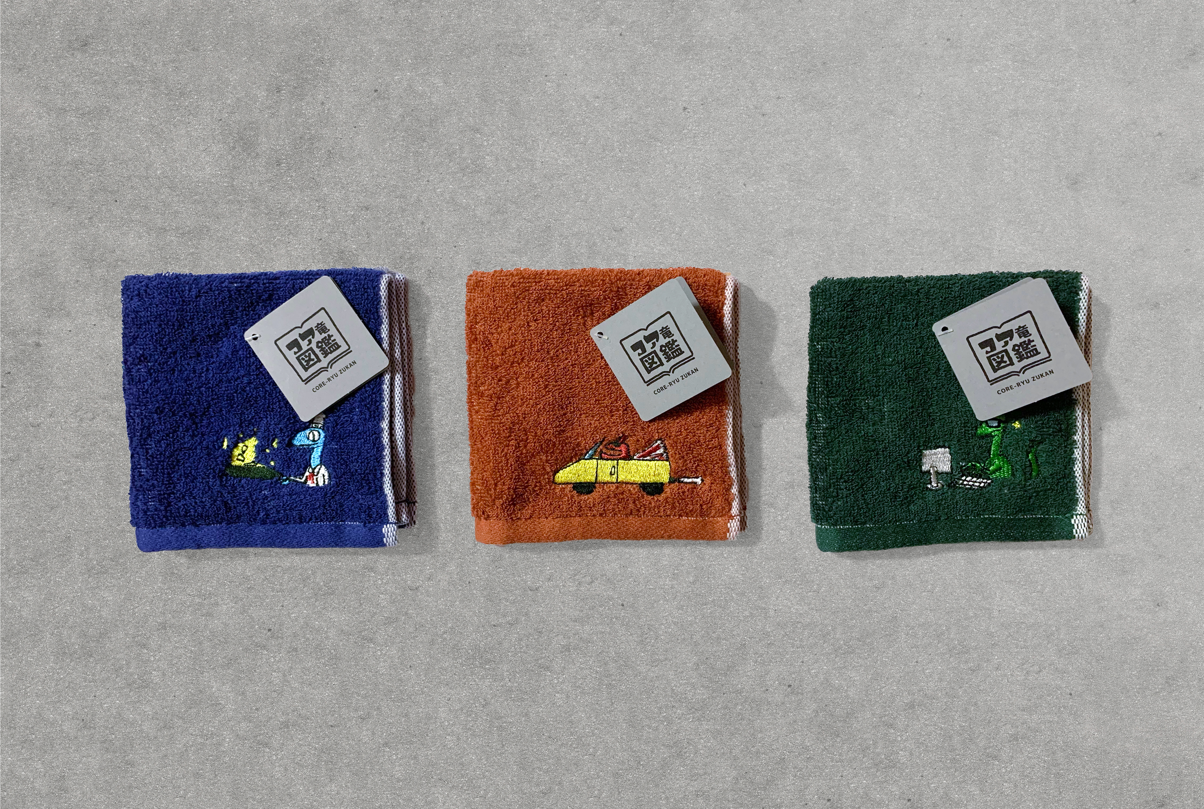 今治タオルの部門で私が担当したアーティストは、恐竜が大好きな高校生の男の子。恐竜のタオルというと子ども向けのものが多い印象ですが、多くの方に作品を知ってもらうことが重要だと考え、大人も持てる配色とワンポイントの刺繍で展開し、アーティストの情報を盛り込んだタグも制作しました。