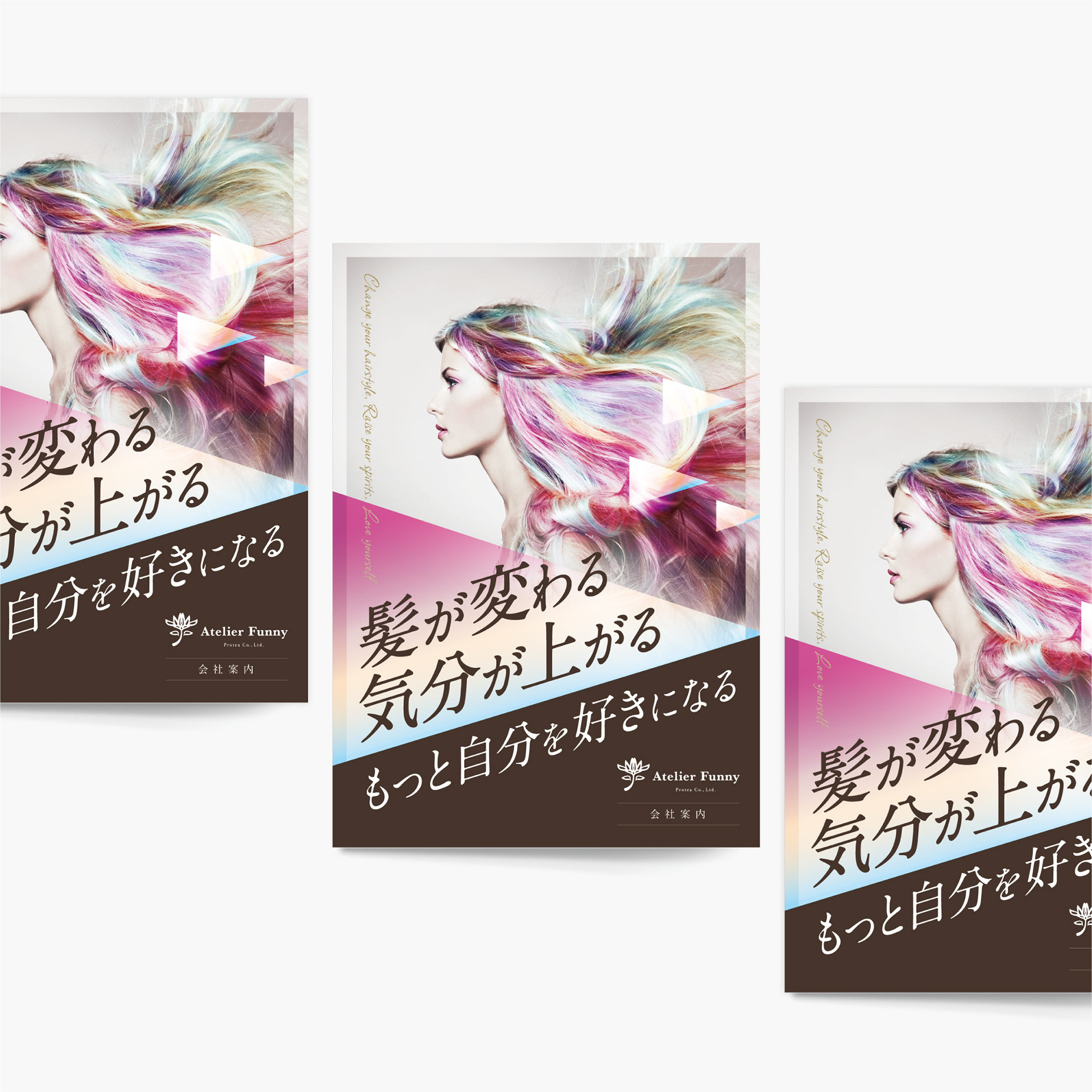 愛媛県四国中央市の美容室「Atelier Funny」さんの会社案内をデザインしました。美容師を目指す専門学生のための採用案内として使用されるもので、前向きでいきいきとした社風が手に取るだけで伝わる誌面を目指しました。