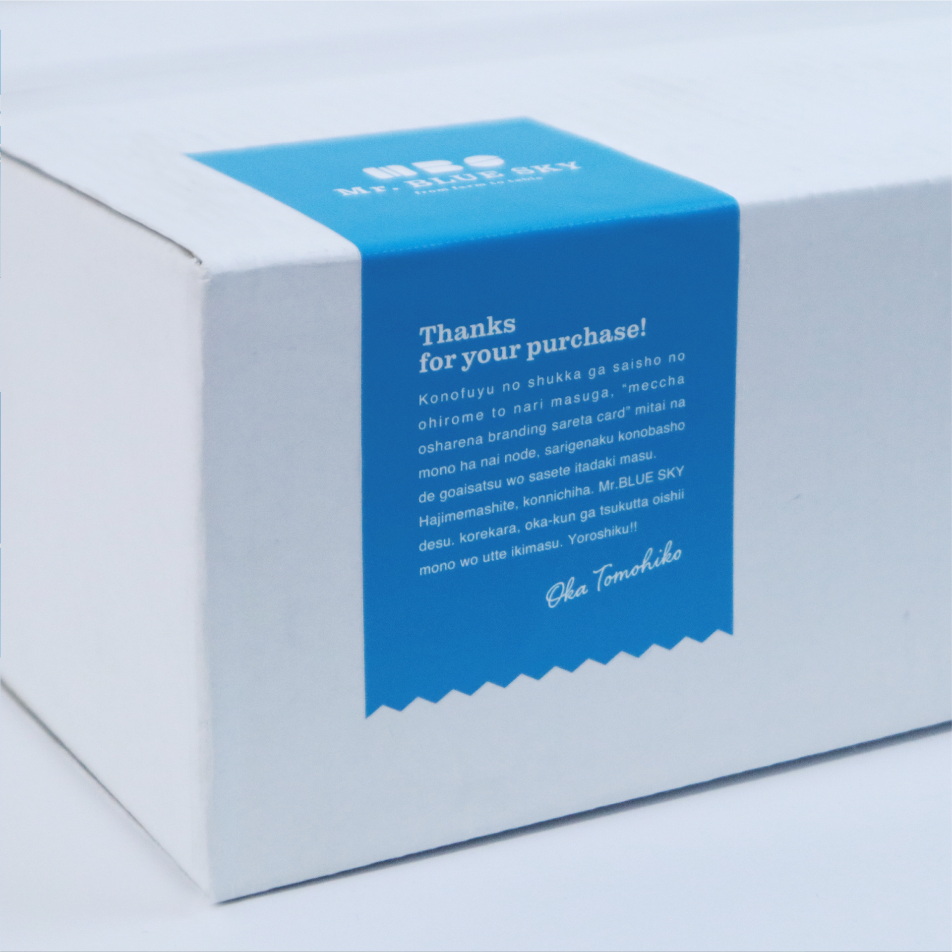 「Mr. BLUE SKY」ブランドデビューの初回限定で、発送箱に使用するご挨拶のステッカーをご採用いただきました。お野菜などを受け取った全国の方がおかくんのことを身近に感じ、クスッと笑えるメッセージを詰め込んでいます。